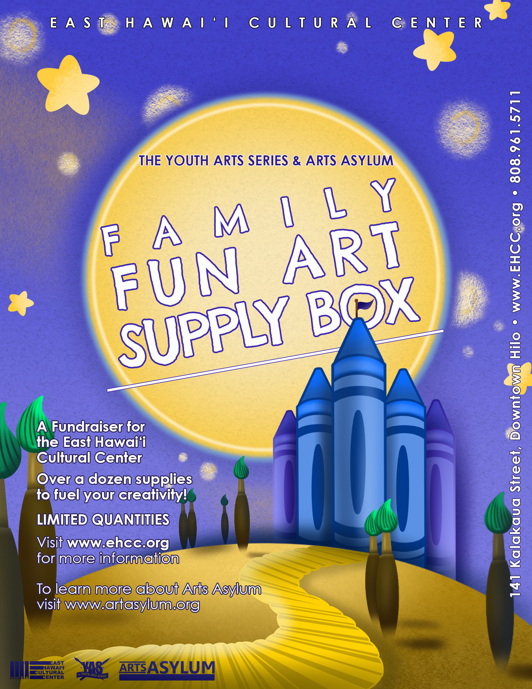 Don’t miss out on your chance to get one of our awesome Arts Asylum Family Fun boxes! With the new school year right around the corner, many of the supplies included in the box can be used to fulfill school supply list requirements. The boxes include #2 pencils, colored pencils, felt-tip markers, crayons and more. Get your school supply shopping done, have a bunch of fun goodies left to create some art, AND Arts Asylum will be donating the proceeds from each of the boxes towards continuing the Youth Arts Series workshops and day-camps at the East Hawai‘i Cultural Center!