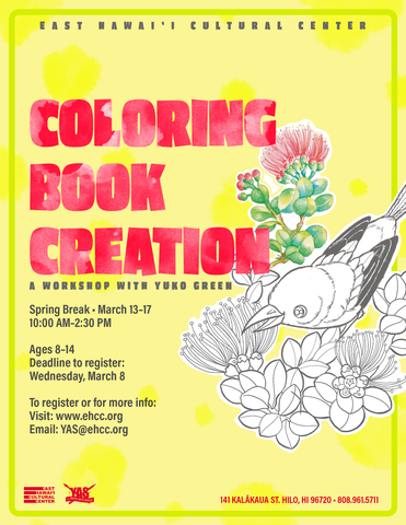 In our spring break Coloring Book Creation class, students will work with local Illustrator, Yuko Green, to create a coloring book. The book will be printed following the conclusion of the class and each student will receive a copy of their own to keep.
