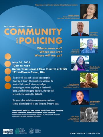 As a first step in fulfilling this commitment, EHCC collaborated with University of Hawai'i-Hilo to conduct a survey on community attitudes toward police (findings here). This culminated in a panel discussion to present the results on May 21, 2023. The event was a platform to discuss the current nature of policing, with a particular emphasis on incarceration, as it disproportionately impacts the lives of Native Hawaiian residents. A video of the proceedings is available on the Nā Leo TV website here, and a written transcript that includes the slides that were presented can be found here. Responses to a written interview conducted in preparation for the event with Christin Johnson, Oversight Coordinator for the Hawaii Correctional Systems Oversight Commission, can be found here.