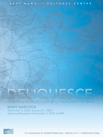 In chemistry, to “deliquesce” is to absorb water to the point of liquifying and melting away, as some salts may do. In a new exhibition at the East Hawai‘i Cultural Center, visual and performance artist Mary Babcock takes this concept and applies it to sea level rise and climate change in the Pacific. Nature absorbs the impact of human interventions, but dissolution may be the end result.