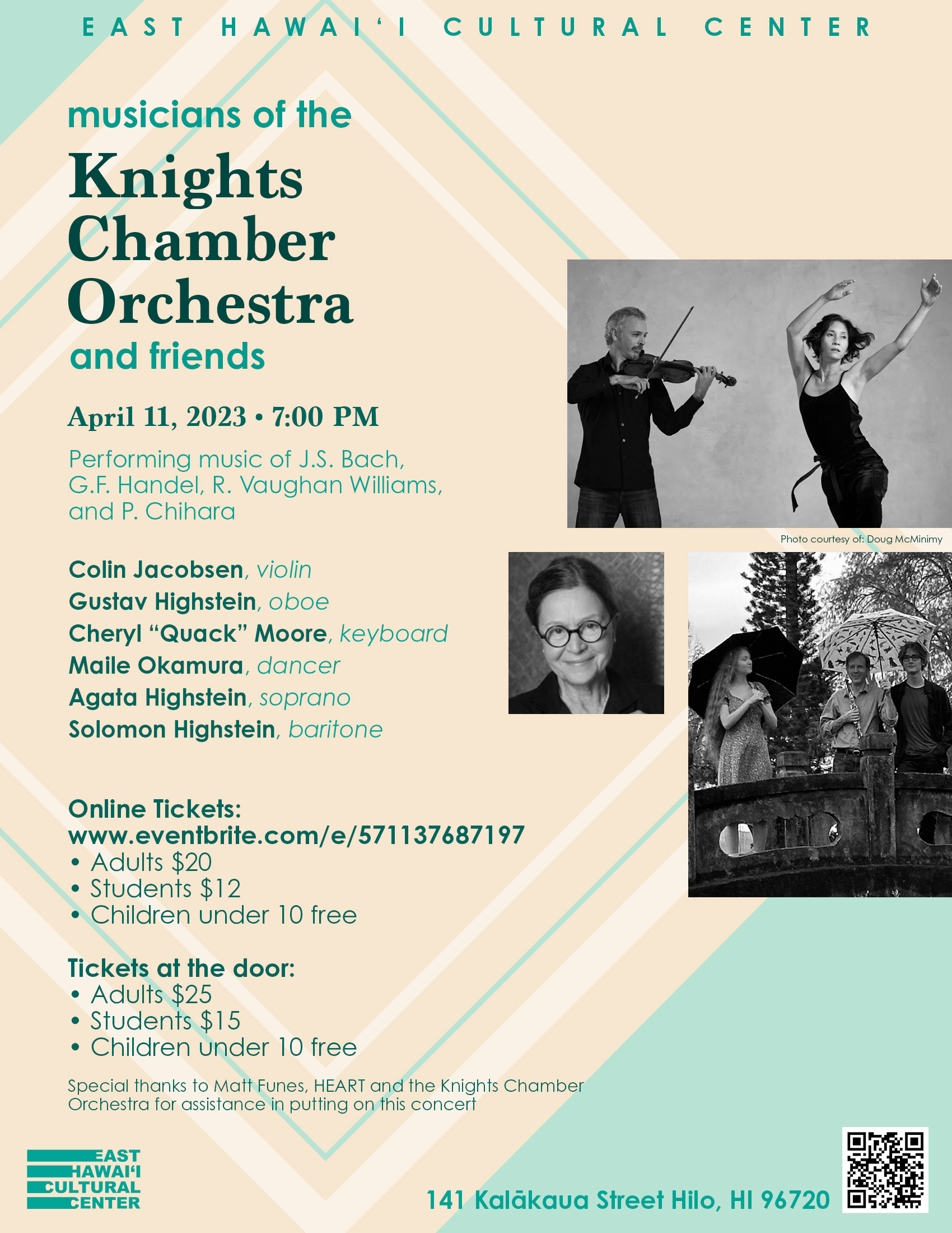 In this special concert, internationally renowned violinist Colin Jacobsen will be joined by oboist Gustav Highstein and friends to perform music of Bach, Handel and Vaughan Williams. Maile Okamura will perform as a dancer.