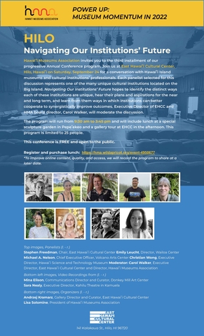 Hawaiʻi Museums Association invites you to the third installment of our progressive Annual Conference program. Join us at East Hawaiʻi Cultural Center, Hilo, Hawaiʻi on Saturday, September 24 for a conversation with Hawaiʻi Island museums and cultural institutions’ professionals. Each panelist selected for this discussion represents one of the many unique cultural institutions located on the Big Island. Navigating Our Institutions’ Future hopes to identify the distinct ways each of these institutions are unique, hear their plans and aspirations for the near and long term, and learn from them ways in which institutions can better cooperate to synergistically improve outcomes. Executive Director of EHCC and HMA board director, Carol Walker, will moderate the discussion.