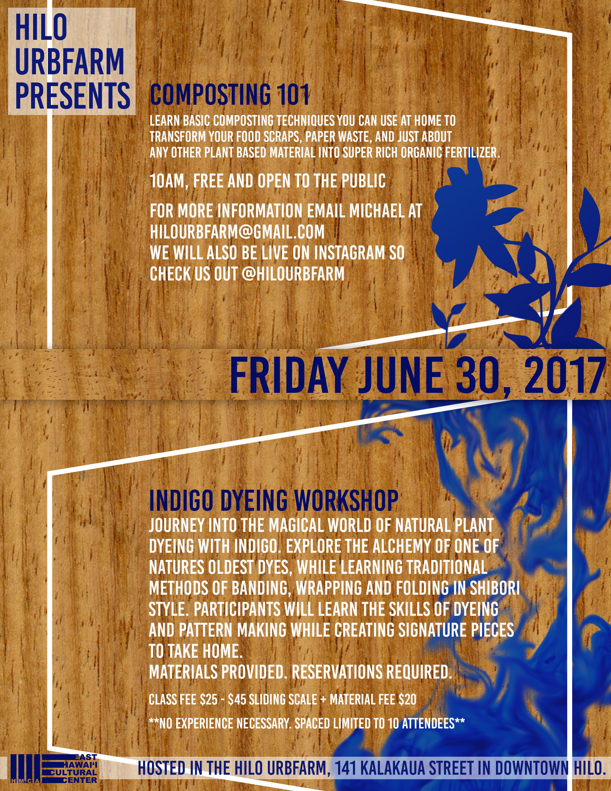 Then later in the afternoon (TBA) INDIGO DYEING WORKSHOP: Journey into the magical world of natural plant dyeing with indigo. Explore the alchemy of one of nature's oldest dyes while learning the traditional methods of banding, wrapping, and folding in Shibori style. Participants will learn the skills of dyeing and pattern making while creating signature pieces to take home.