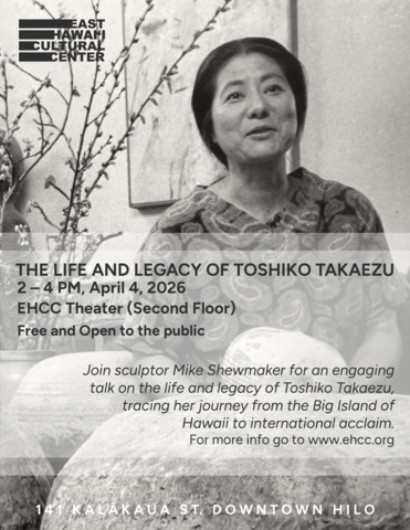 Toshiko Takaezu was one of the most important artists to emerge from the Big Island of Hawaii in the 20th century. Bringing her unique synthesis of wabi-sabi and abstract expressionism to ceramics, Toshiko navigated a field historically dominated by men to create some of the most treasured ceramic works collected today. On April 4th from 2-4 PM at East Hawai'i Cultural Center's 2nd Floor Theater, Mike Shewmaker, a working sculptor in Toshiko's hometown, Pepeekeo, will guide us through her journey from Big Island girl to Princeton educator, to her retrospective at the Noguchi Museum, now a major exhibition at the Honolulu Museum of Art.
