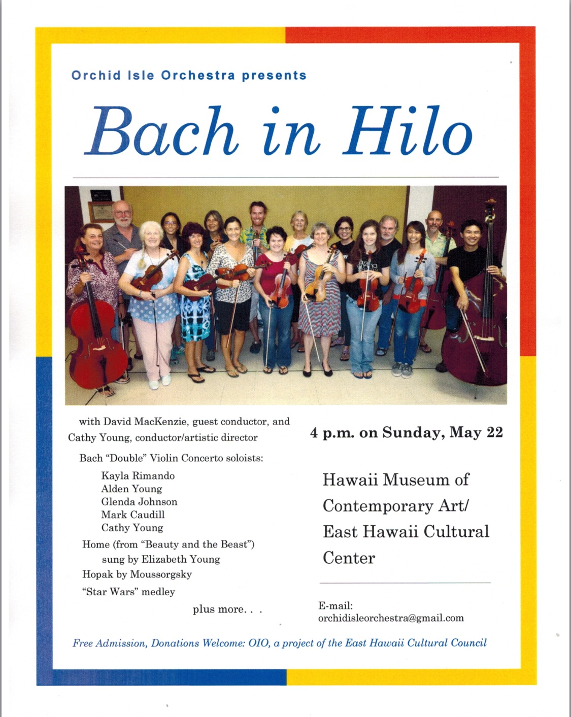 Orchid Isle Orchestra will be Bach in Hilo on Sunday, May 22, at 4p.m., at the East Hawaii Cultural Center/Hawaii Museum of Contemporary Art. Bach's Double Violin Concerto will be featured. Alden Young returns from his first year of violin study at Boston Conservatory and will join graduating Waiakea High School senior Kayla Rimando as soloists in the first movement. Violin teachers Glenda Johnson and Cathy Young will solo for the second movement. St. Joseph's math teacher Mark Caudill will join Cathy Young in the final movement while guest conductor David MacKenzie leads the accompanying orchestra.