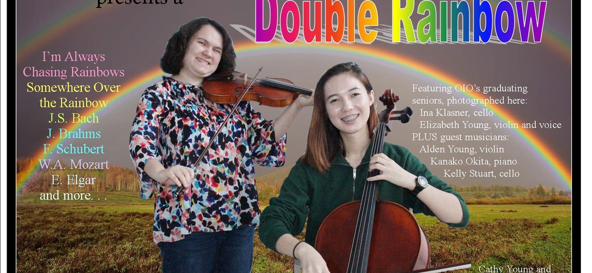 OIO will create a Double Rainbow of music with two Rainbow songs, two Serenades, and two movements from Mozart’s Quartet No. 8. OIO bids farewell to two graduating Hilo High School students, Ina Klasner and Elizabeth Young. Both college-bound seniors will perform familiar solos with OIO accompaniment. OIO’s principal cellist Ina Klasner will play Schubert’s Serenade. OIO violinist and singer Elizabeth Young will sing Somewhere Over the Rainbow.