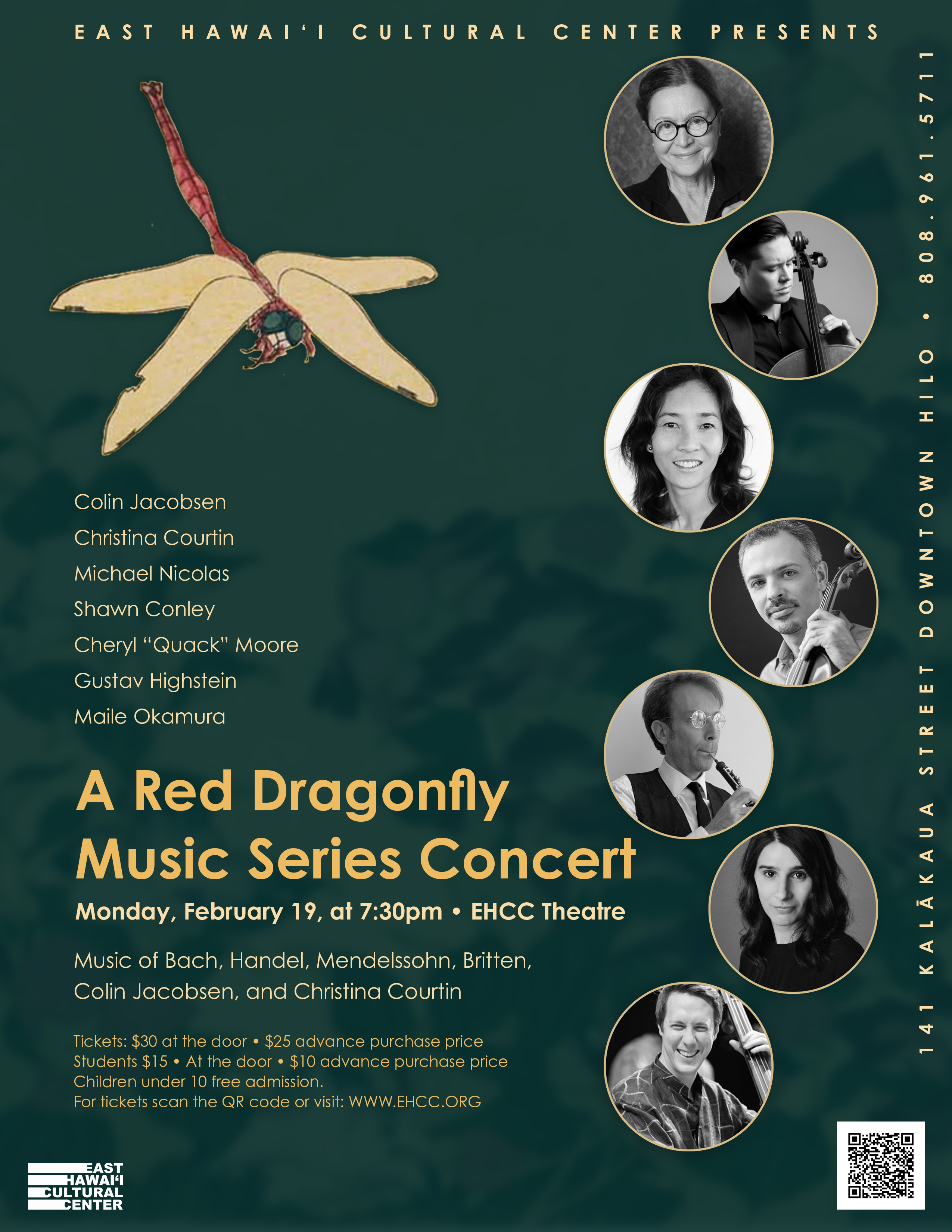 Please join us for an evening of chamber music with musicians of Hawaii Symphony, The Knights chamber orchestra, and the Big Island’s Cheryl “Quack” Moore. Program including movements of Handel’s Water Music, Mendelssohn’s Piano Trio in d minor, J.S. Bach cantatas, and recent works of Colin Jacobsen, and songs of Christina Courtin. One night only!