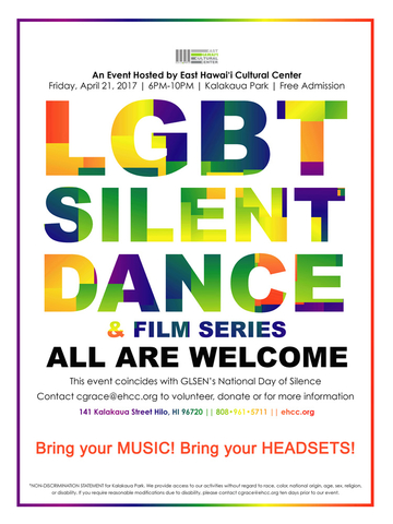 The East Hawaii Cultural Center/Hawaii Museum of Contemporary Art (EHCC) in Hilo, Hawaii is hosting its first annual Silent Dance Party & LGBT Film Festival on Friday, April 21, 2017 at the historic Kalakaua Park and we ask for your kokua. The event coincides with the Gay, Lesbian and Straight Education Network (GLSEN) Day of Silence, a national activity that brings attention to anti-LGBT name-calling, bullying and harassment in schools, illustrating the silencing effect these incidents have on LGBT individuals.