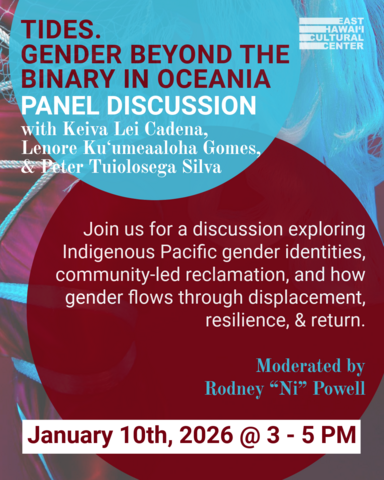 As part of the TIDES exhibition, this January panel discussion brings together powerful Indigenous Pacific voices to explore how gender long understood across Oceania beyond Western binaries has endured, adapted, and returned through culture, care, and resistance. Featuring Keiva Lei Cadena, a Native Hawaiian transgender advocate and cultural practitioner; Kuʻumeaaloha Gomes, a revered Hawaiian healer, educator, and early leader of Nā Mamo o Hawaiʻi; Rodney “Ni” Powell, a Pacific Island social worker, tattooist, and longtime UTOPIA collaborator; and Peter Tuiolosega Silva, CEO of Kumukahi Health and Wellness and decades long māhū and LGBTQ advocate, the panel reflects on community led movements like UTOPIA and Nā Mamo o Hawaiʻi and asks how gender moves like tides shaped by displacement, resilience, and return.