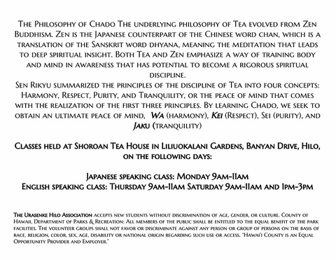 CLASSES HELD AT SHOROAN TEA HOUSE IN LILIUOKALANI GARDENS, BANYAN DRIVE, HILO,