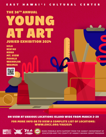 Young At Art is a community-based art experience. The exhibit will be on view at multiple locations across Hawai‘i Island. Locations include small businesses, public libraries, County facilities and more.