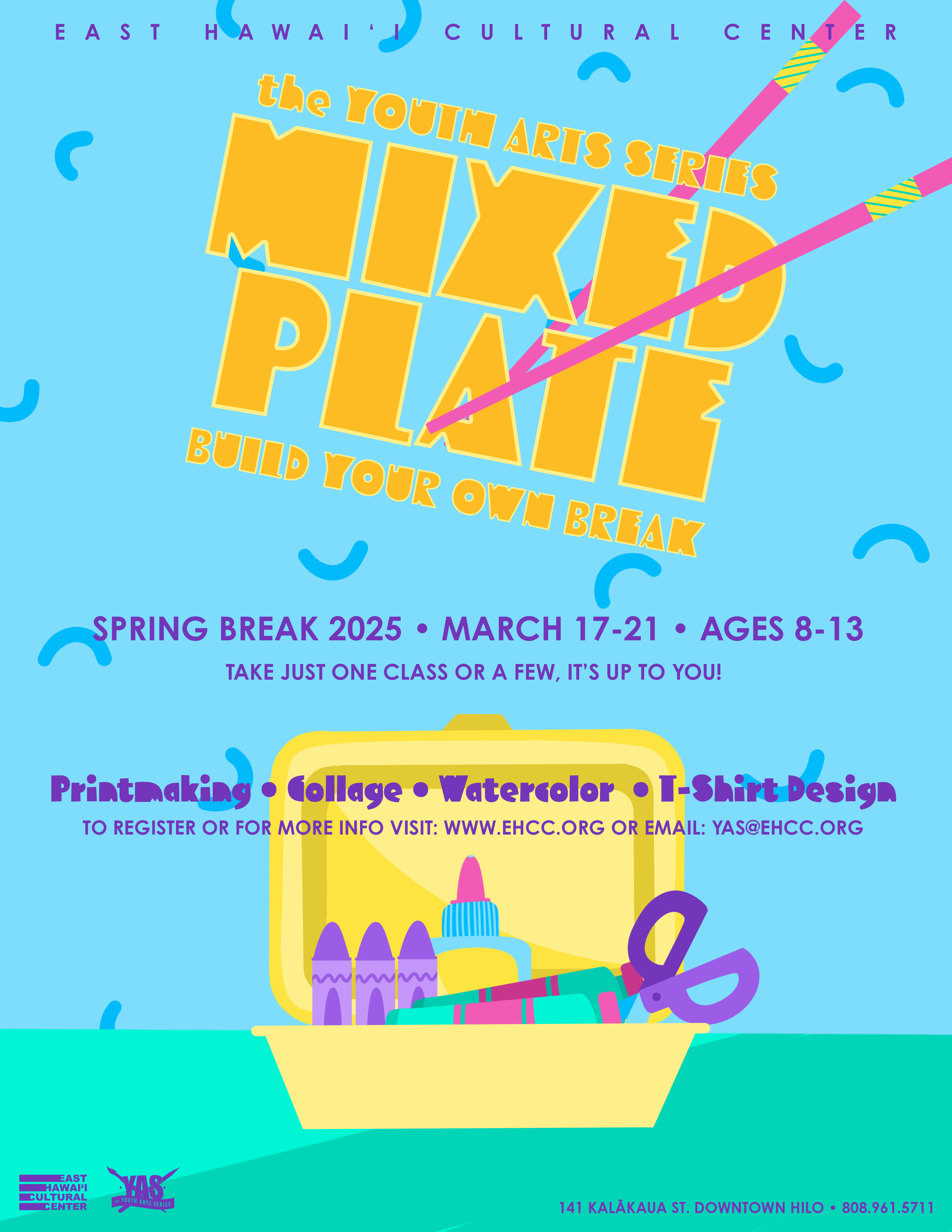 Monday & Tuesday12:30-2:00Enrollment Fee:$25.00 - EHCC Members$30.00 - Non MembersWant to make colors dance on paper? In this watercolor class students will begin by learning about color theory through creating a color wheel. They’ll utilize their color theory to create a painting of a bunny under the guidance of the instructor. Within their painting composition they’ll learn a variety of painting techniques including resist, wet on wet, and wet on dry.Bio:Aria Delgado is a junior at University of Hawai’i at Hilo, majoring in Art. In her high school years, she participated in both California State Semester School of the Arts and CalArts Discovery Animation Summer Program. She has been a freelance artist for a few years now, using digital and traditional art. After joining EHCC’s volunteer team in 2024, she hopes to inspire and spread the importance of personal expression in the art she teaches. Learn More -