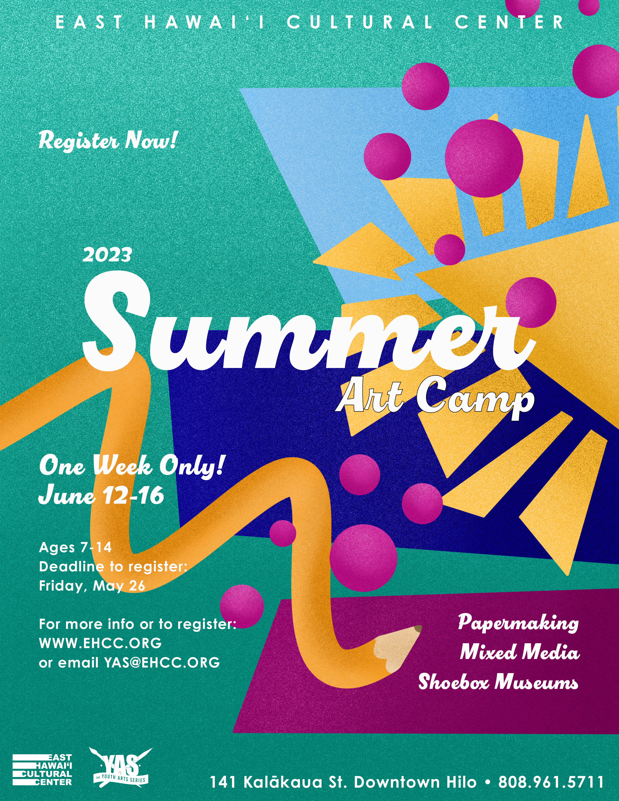 Program Description: The Youth Arts Series (YAS) annual Summer Art Camp is back for its 6th session! Keiki will join our talented local artists for creative adventures. In this year's summer session, the YAS team of skilled instructors will guide young artists through the process of learning a variety of mediums. Our student artists will create their own works of art while learning basic technical skills behind each medium.