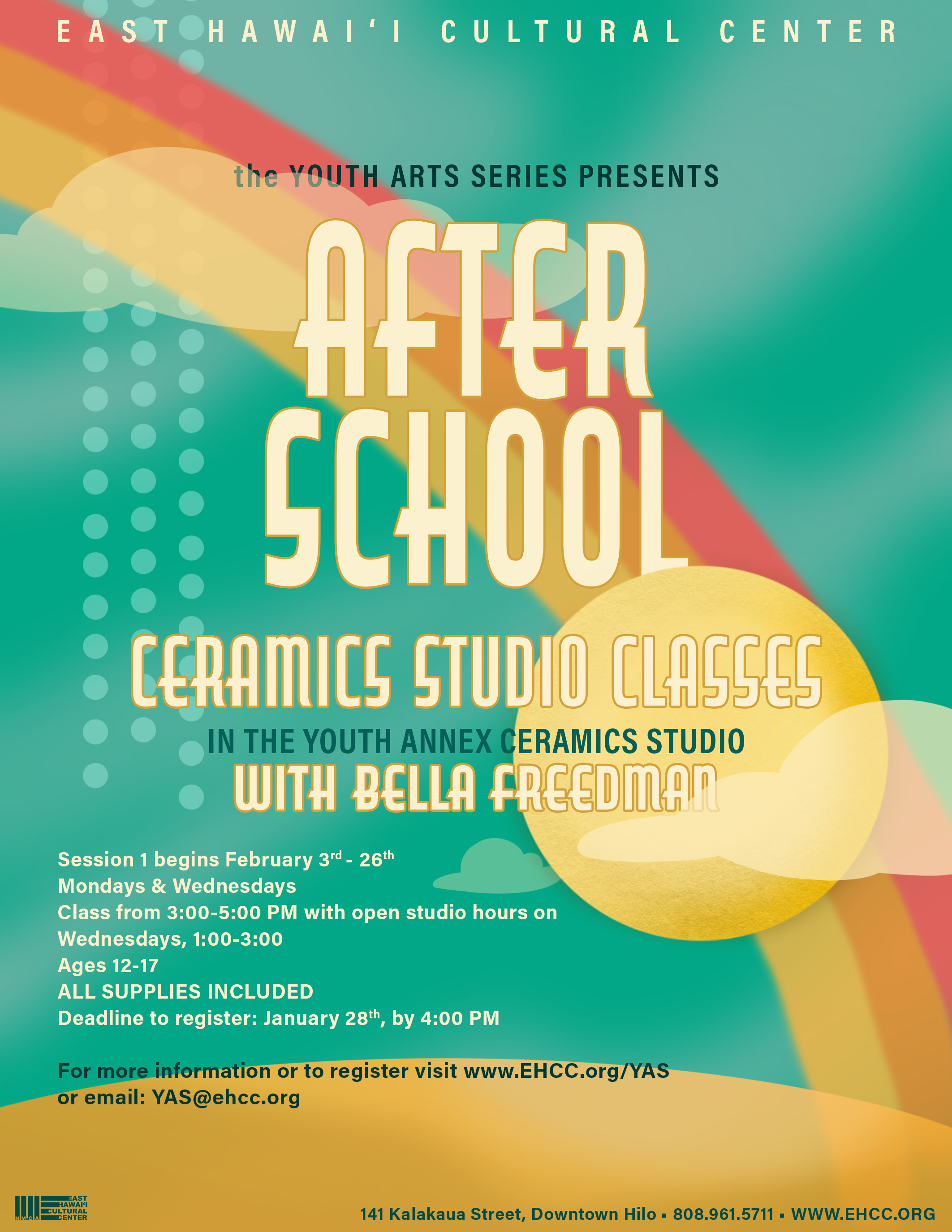 YAS is expanding this year! New classes, new opportunities to make art. More classes are in the works, be sure to keep up with us, follow the East Hawai‘i Cultural Center on social media and sign up for our email list (be sure to put a check mark in the YAS box).
